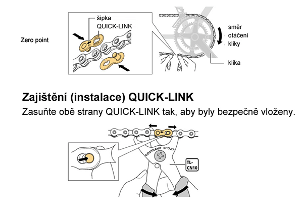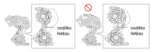 Důležité: Nezapomeň řetěz správně provléct přehazovačkou a umístit loga řetězu směrem ven.