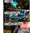 - Při první aplikaci na již používaný řetěz možná zjistíte, že váš řetěz zčerná. To je práce LinkLube, který během jízdy vytlačuje špínu z hloubky řetězu. Pokračujte v jízdě, odmašťování, mazání, dokud váš řetěz nebude opět lesklý a čistý!