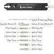 - 17 funkcí: centrovací klíč; klíč na jádra ventilků, bity: rovný šroubovák #3.5 a křížový Phillips #2 imbusy 2, 2.5, 3, 4, 5, 6, a 8mm; torxy T10, T25; kleště na rychlospojky řetězů; čistič zalepených těl ventilků; kleště na dotažení x povolení matky ventilků